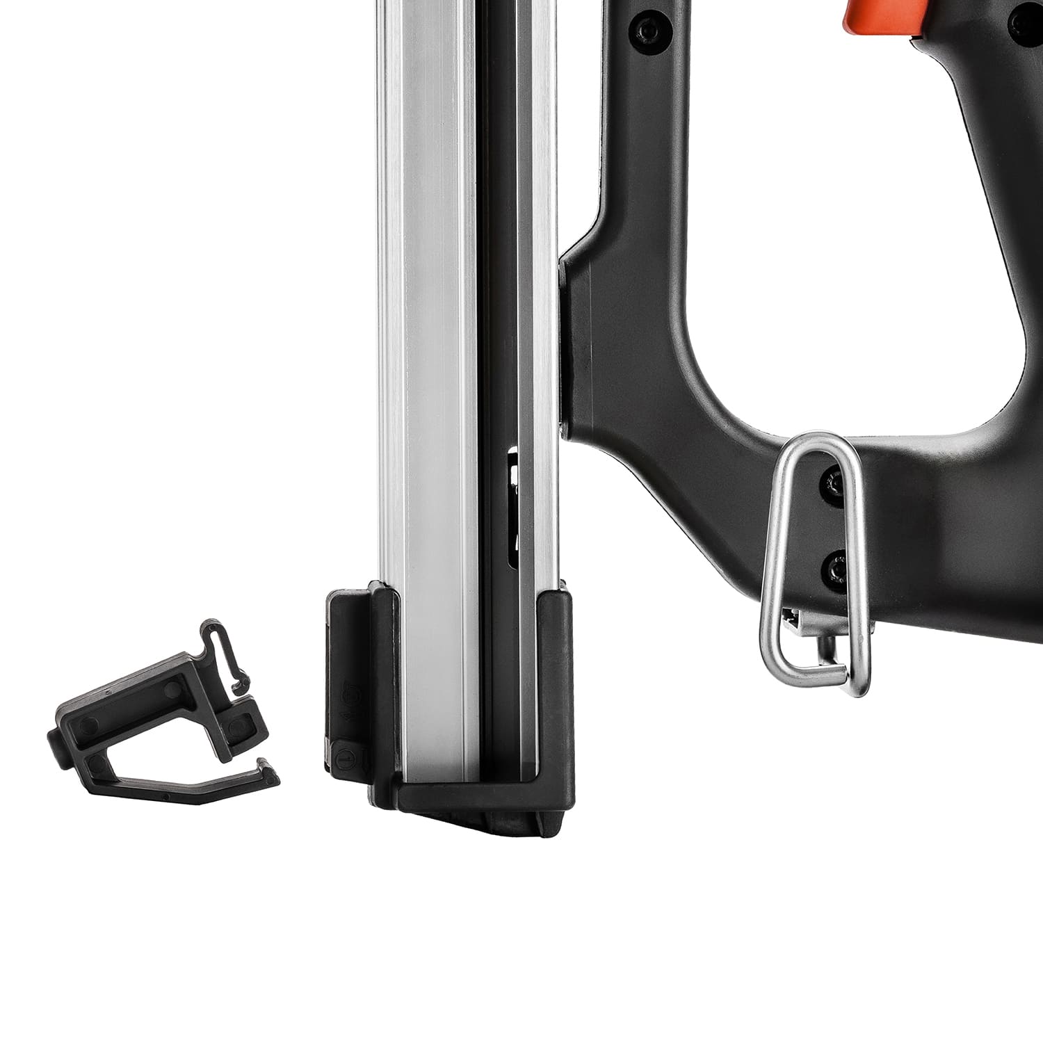 - Быстросъемный магазин с упрощенной системой загрузки гвоздей - это упрощает работу с инструментом в плотных перчатках, на высоте или одной рукой, когда надо придерживать материал пристрелки.